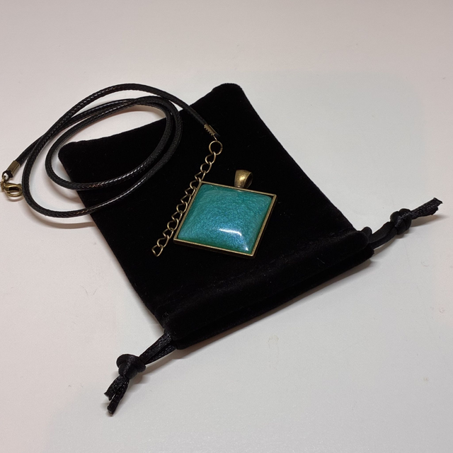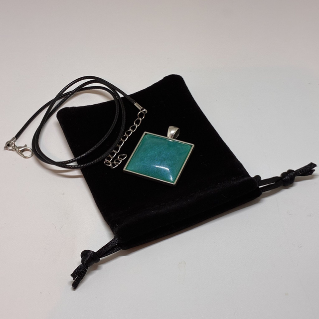 Vierkante ashanger met zilver- of antiek bronskleurig frame, inclusief verstelbare ketting van gevlochten leer in een zwart fluwelen zakje. De as zal worden fijngemalen tot poeder die vervolgens zal worden vermengd met het mica poeder die de kunsthars kleur zal geven. Kies voor het as-verzendpakket om de as veilig aan te leveren. Het sieraad zal binnen 5 werkdagen na het ontvangen van de as worden verzonden.